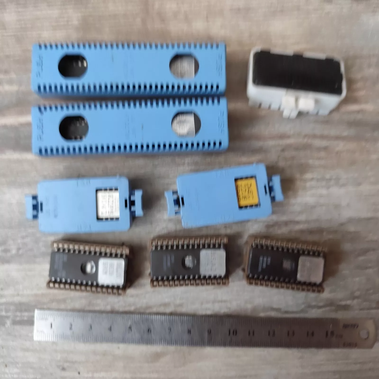 The lot includes EPROMs in blue and white ZIF carriers and loose chips as shown in the photos.