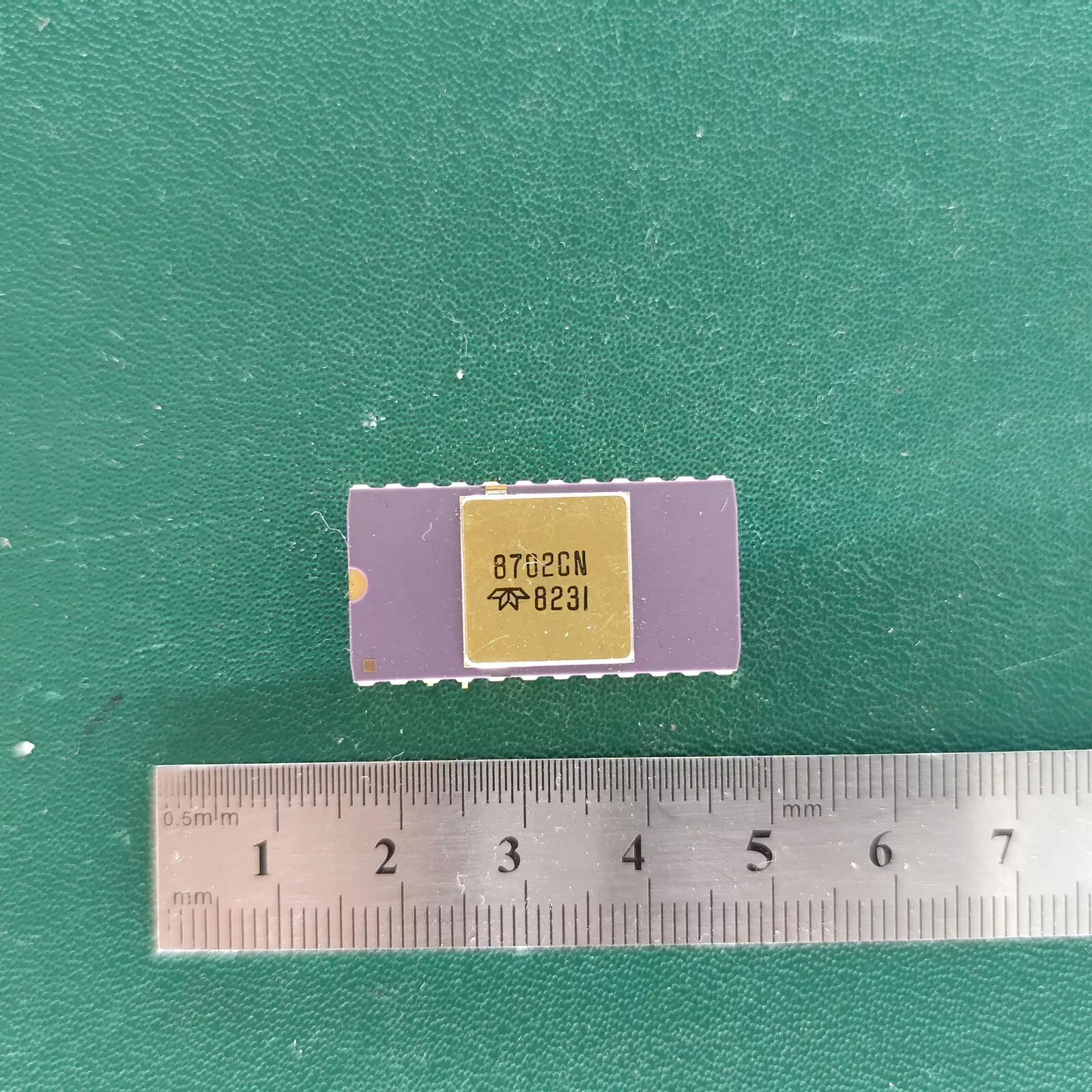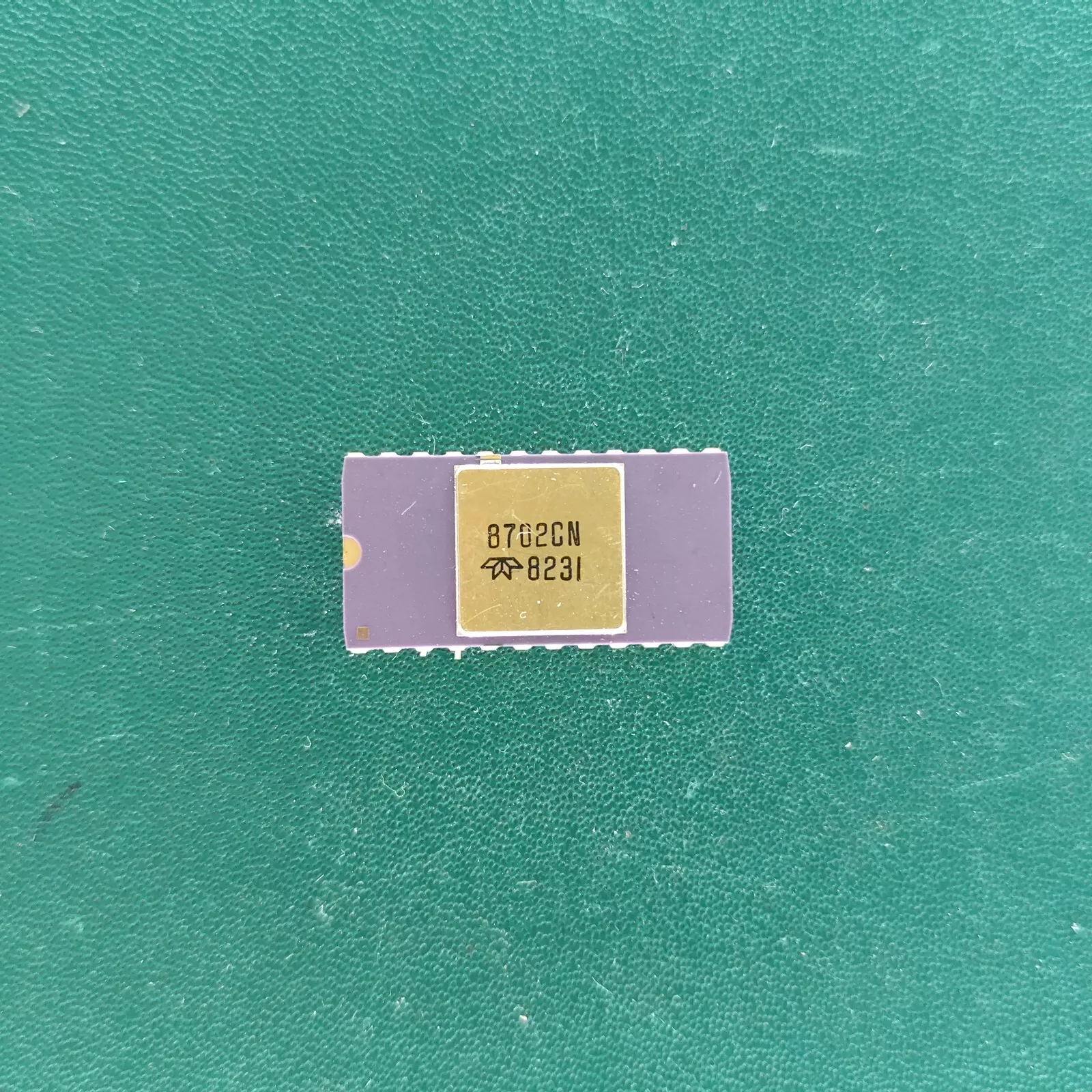 8702CN ceramic IC with gold top and gold pins on green background
