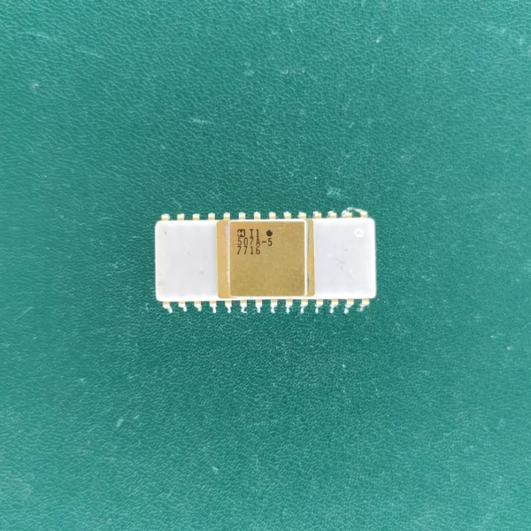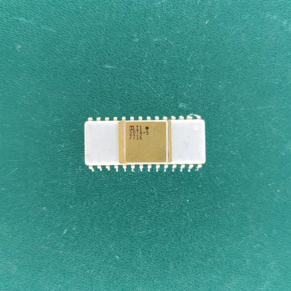 The Hitachi HD509A-5 is a vintage integrated circuit manufactured in the late 1970s. It comes in the distinctive white ceramic DIP package with gold lid and gold pins, a hallmark of high-quality semiconductor production during that era. The date code 7716 (16th week of 1977) indicates its early manufacturing period, making it highly collectible today.