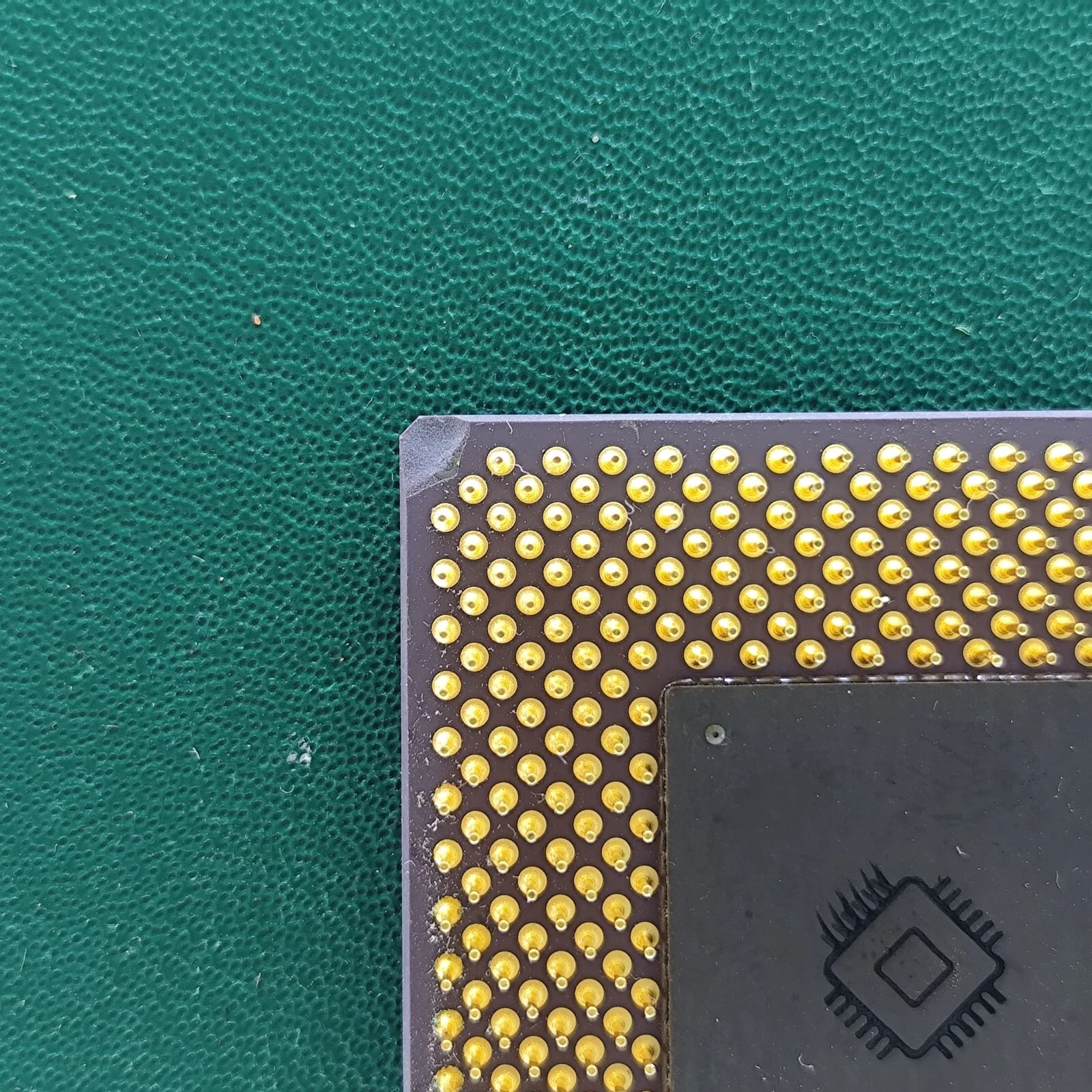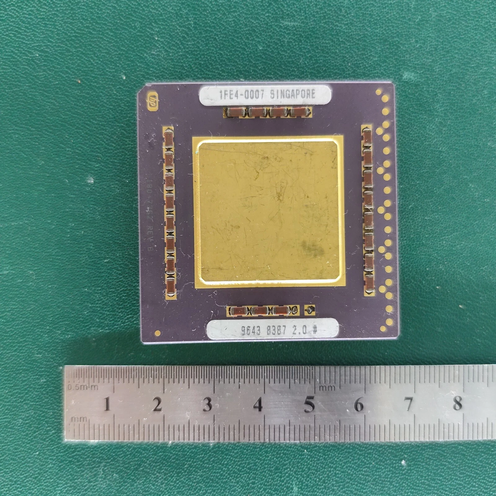 HP 1FE4-0007 ceramic CPU substrate with a large gold top plate on a green background.