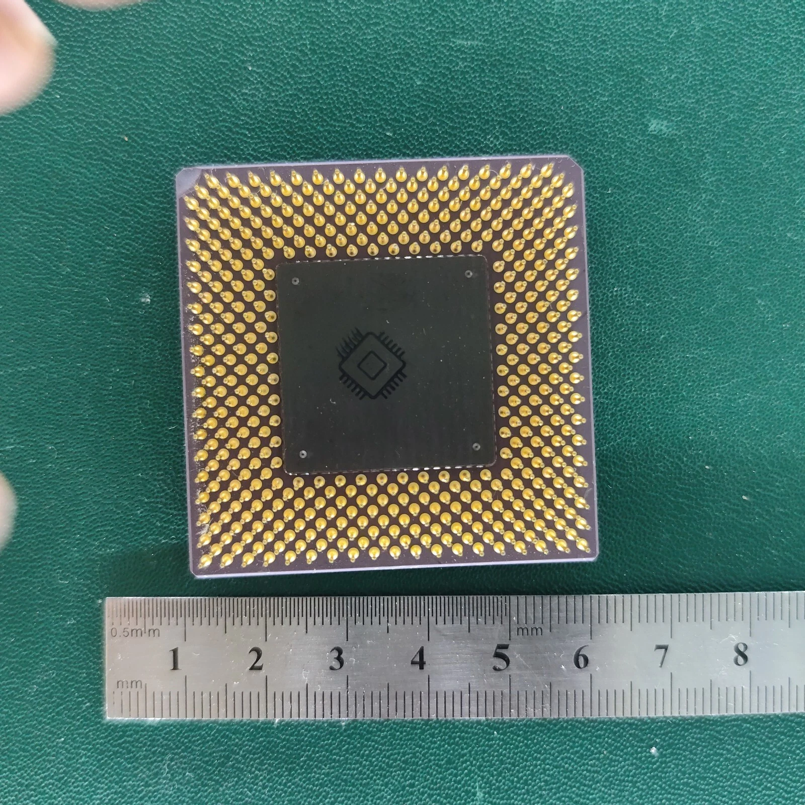 LSI Logic LS4885 ceramic PGA substrate with gold pads on a green background.