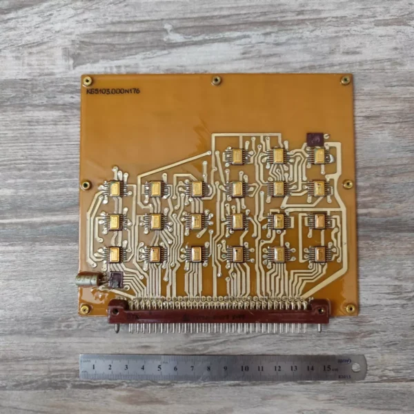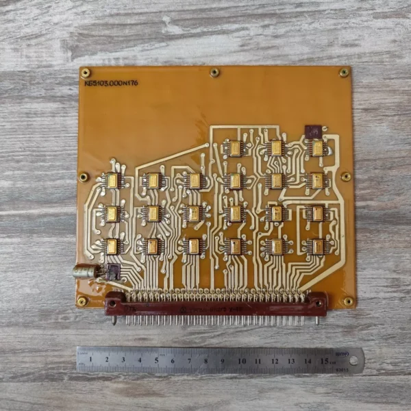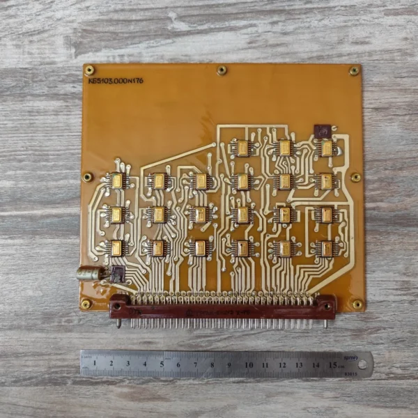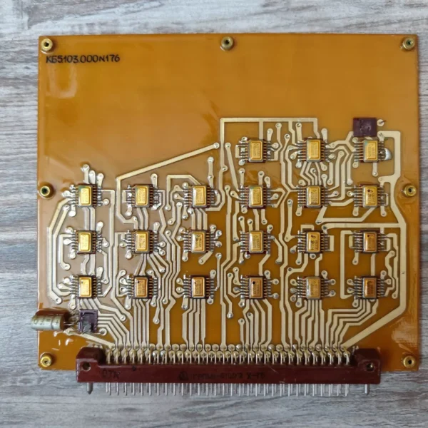 The K54103.000N176 is a rare Soviet-era PCB module featuring multiple ceramic integrated circuits with gold caps, mounted on a classic brown fiberglass board. These types of modules were developed in the 1970s–80s for use in aerospace, military, and industrial control systems within the USSR.