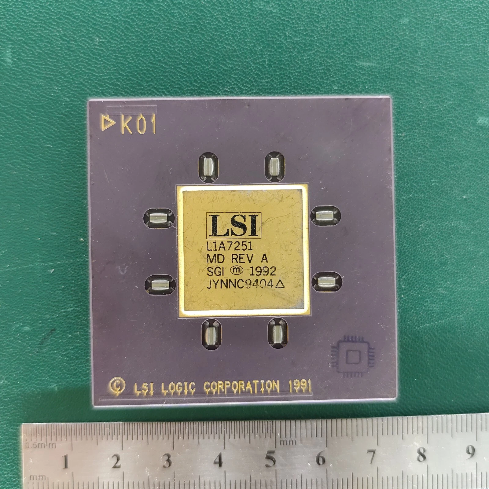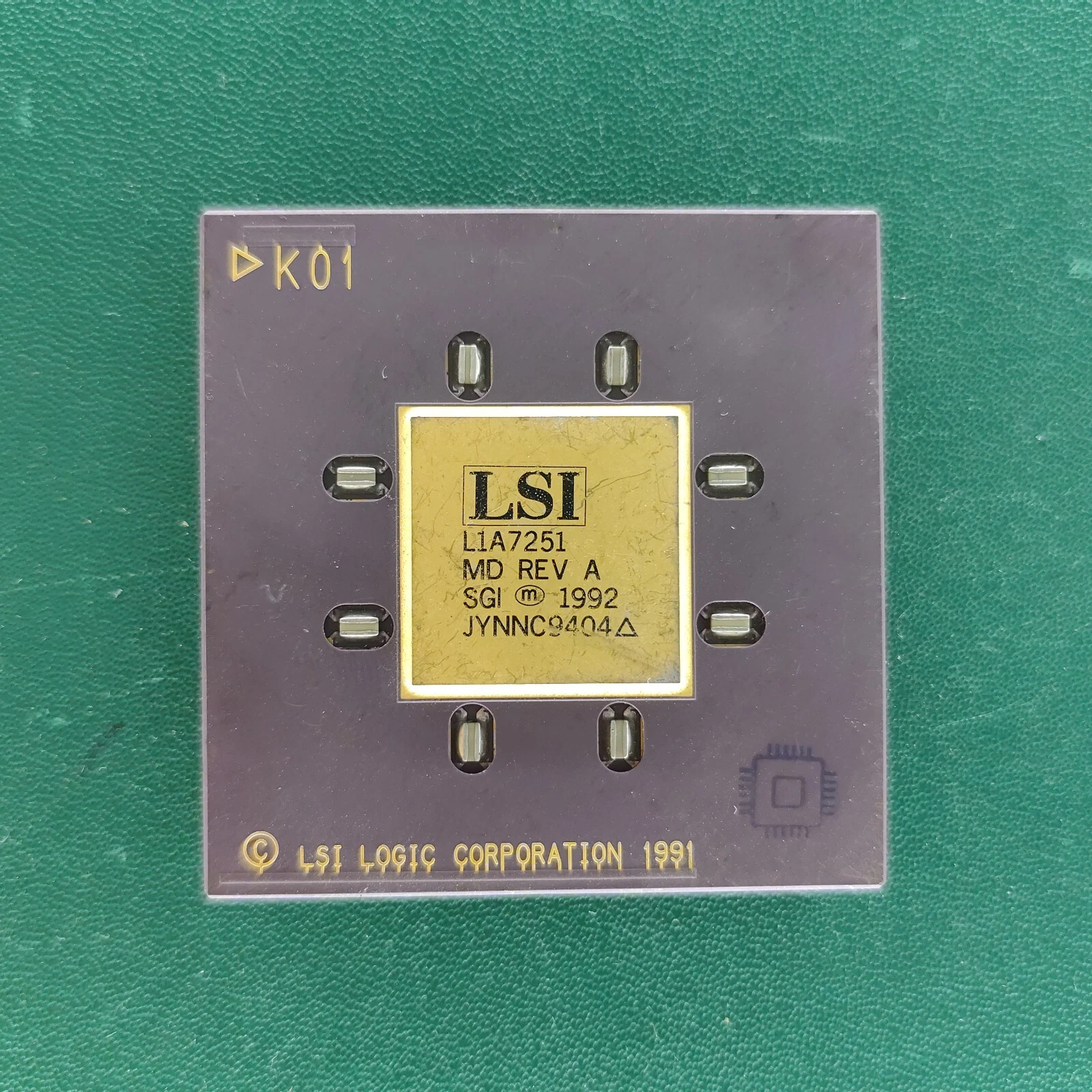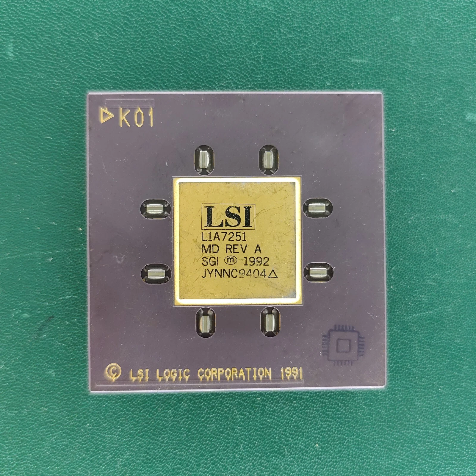 LSI L1A7251 MD Rev A ceramic SGI chip with gold top on green background