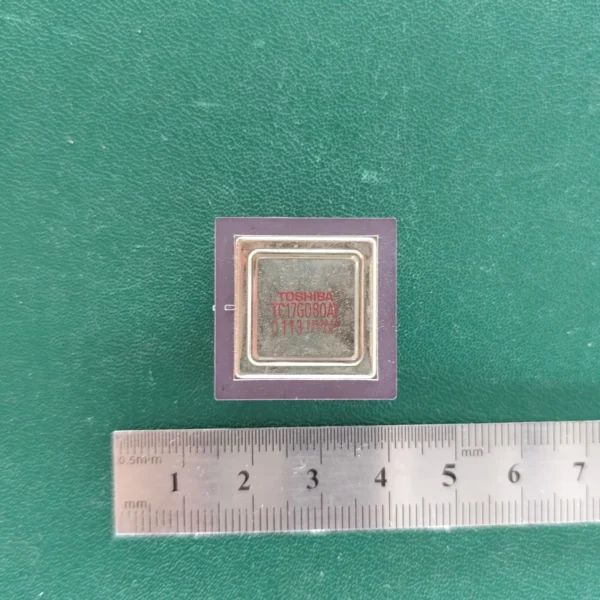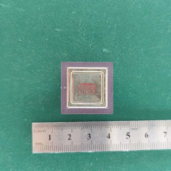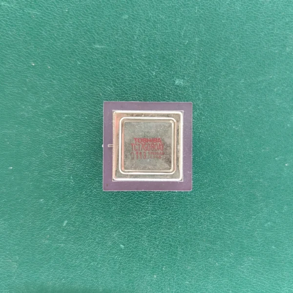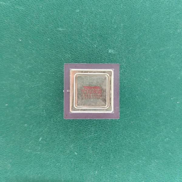 The Toshiba TC17G080A is a vintage ASIC integrated circuit in a ceramic PGA package with metal lid, manufactured in the early 1990s. Components like this were widely used in industrial controllers, computing hardware, and telecommunications equipment.